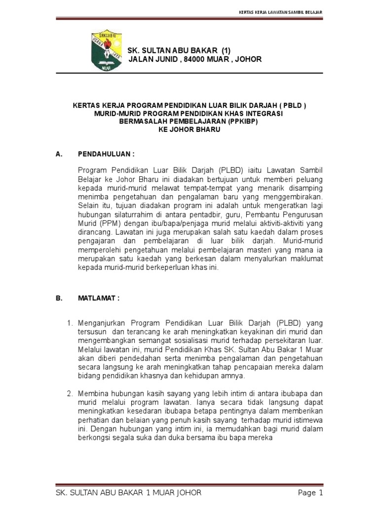 2 ogos 2018 anjuran program pendidikan khas integrasi bermasalah pembelajaran sekolah menengah kebangsaan baroh pial 17200 rantau panjang, kelantan. Planetarium sultan iskandar<b> kilang !n be#erage dan kilang see $uat ice cream sdn. Kertas kerja lawatan pelajar asrama skrs ke sk sebauh 2. 2.0 tujuan kertas kerja 1. Nur syarafana nabilah binti mohd.