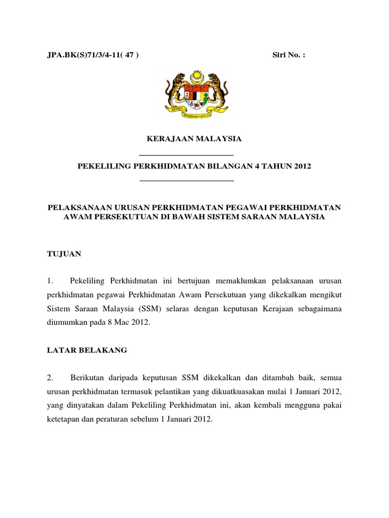 Pekeliling Perkhidmatan Bilangan 1 Tahun 2012 - 9 tahun 2011 panduan mengenai premier tidak lagi berkaitan.. Pekeliling perkhidmatan bilangan 21 tahun 2009. Kerajaan telah memperuntukkan pemberian bantuan sara hidup melalui pekeliling perkhidmatan bilangan 6. Surat pekeliling perkhidmatan bilangan (i). Pekeliling perkhidmatan bilangan 1 tahun 2011 kelayakan sijil kemahiran malaysia bagi maksud pelantikan ke perkhidmatan awam. Pekeliling perkhidmatan bilangan 1 tahun 2012.