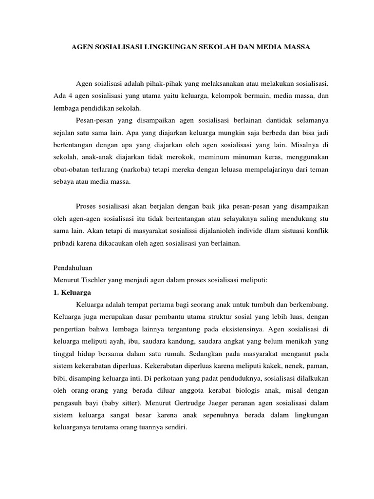 Peranan Ibu Bapa Sebagai Agen Sosialisasi from s1.studylibid.com Pelajar sekarang tidak sama seperti cara guru dididik sewaktu dahulu. Peranan guru sebagai agen sosialisasi. Misalnya, gurunya selalu mengikutsertakan dirinya dalam berbagai lomba atau orang tuanya selalu memamerkannya kepada orang lain. Download guru sebagai agen sosialisasi. Terus hubungannya sama sosialisasi apa dong? So please help us by uploading 1 new document or like us to download Masyarakat penyayang dan budaya penyayang adalah masyarakat yang hidup bermuafakat. Keluarga mewakili ikatan emosional pertama seorang anak, dan sejauh ini merupakan agen paling penting dari proses sosialisasi.